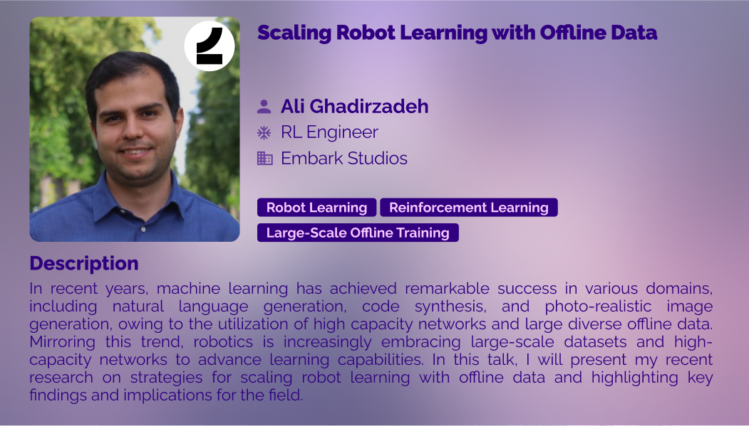 Ali Ghadirzadeh received his BSc in Electrical Engineering from Ferdowsi University in 2010. He received MSc and PhD degrees from the division of Robotics, Perception and Learning at KTH Royal Institute of Technology in 2013 and 2018, respectively. In 2022, he completed his postdoc assignment at Stanford University on robot learning, the intersection of robotics, computer vision and machine learning. He is currently working as reinforcement learning researcher. His main research interest lies in acquiring robotic skills through physical interaction.