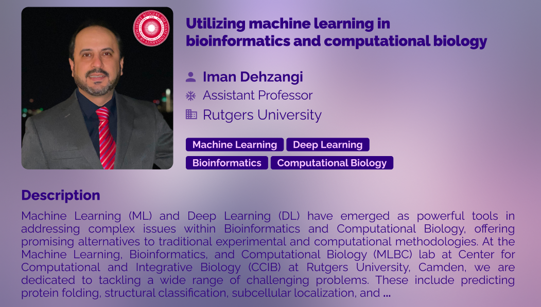 Machine Learning (ML) and Deep Learning (DL) have emerged as powerful tools in addressing complex issues within Bioinformatics and Computational Biology, offering promising alternatives to traditional experimental and computational methodologies. At the Machine Learning, Bioinformatics, and Computational Biology (MLBC) lab at Center for Computational and Integrative Biology (CCIB) at Rutgers University, Camden, we are dedicated to tackling a wide range of challenging problems. These include predicting protein folding, structural classification, subcellular localization, and post-translational modifications (PTMs), alongside problems in biomedical image processing, cancer detection, and cancer subtype identification. Our approach involves leveraging various classification techniques, with an emphasis on deep learning architectures trained on novel features extracted from evolutionary and structural properties of proteins and genes. In this presentation, I will discuss both past and ongoing research aimed at constructing integrated models to tackle these challenges, while also outlining future directions for solving these crucial issues.