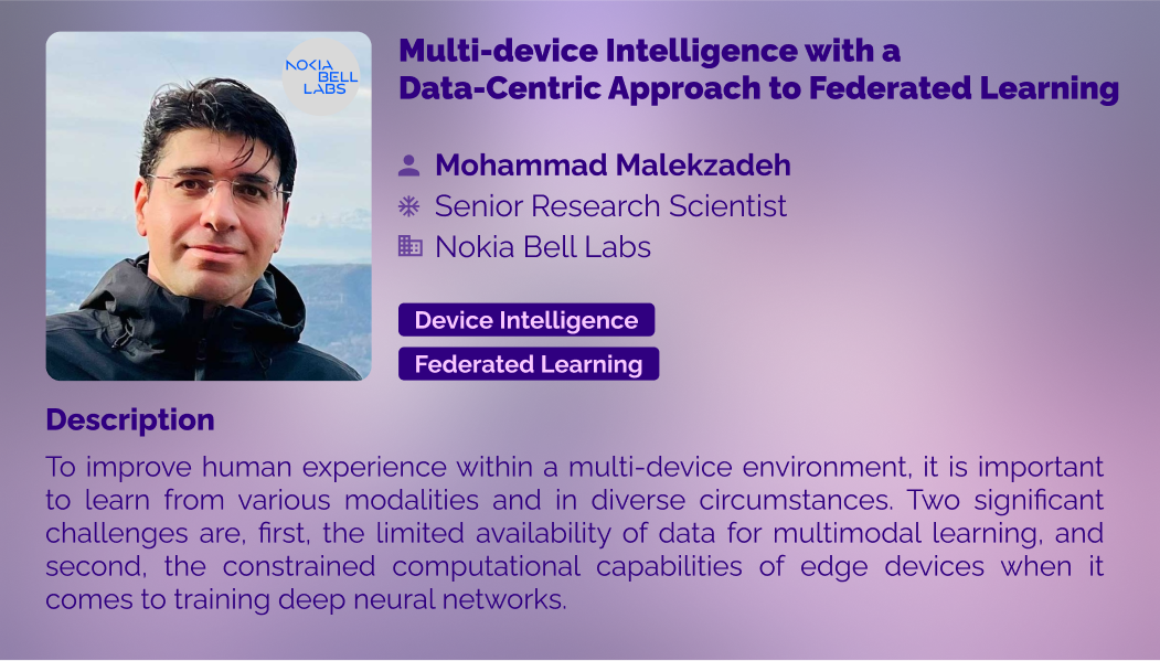 Mohammad Malekzadeh is a Senior Research Scientist in the Device Research department at Nokia Bell Labs in Cambridge, UK. He leads the Device Intelligence team, focusing on Machine Learning solutions for personal devices, with an emphasis on efficiency, collaboration, adaptability, and privacy. Before joining Bell Labs, He worked as a Postdoctoral Research Associate at Imperial College London's Information Processing and Communications Lab, closely collaborating with Prof. Deniz Gunduz on Privacy-Preserving and Trustworthy Machine Learning. He pursued his PhD in Computer Science at Queen Mary University of London as a member of the Centre for Intelligent Sensing, concurrently holding a Research Assistant position at Imperial College London contributing to the Databox Project in the Systems and Algorithms Laboratory. In his PhD, he had the chance to work with great advisors, Prof. Hamed Haddadi, Dr. Richard G. Clegg, and Prof. Andrea Cavallaro, on developing Machine Learning Algorithms for Privacy-Preserving Personal Data Analytics, particularly for data captured by mobile and wearable devices. During his PhD journey, he interned at Brave Software Research, where he explored privacy-preserving techniques to improve content personalization in web browsers. Prior to PhD, he earned an MSc degree in Computer Engineering from Sharif University of Technology in Iran.
