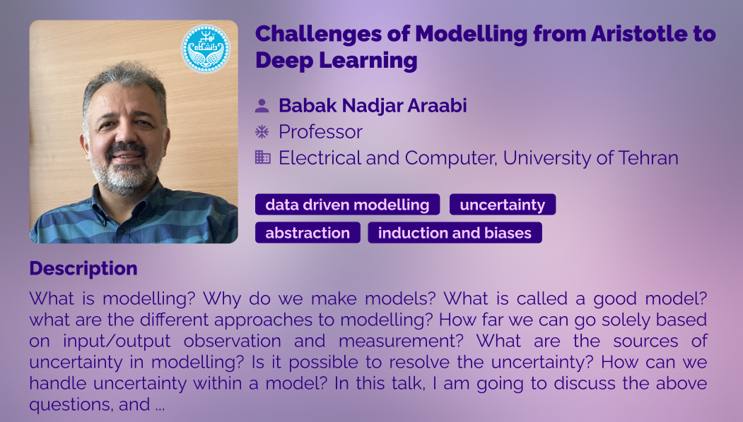 Babak N Araabi was born in 1969 in Tehran. He has got BS, MS, and PhD degrees in 1992, 1996, and 2001, from Sharif Univ. of Tech., Univ. of Tehran, and Texas A&M Univ., respectively, all in Electrical Engineering. He joined the School of ECE at Univ. of Tehran in 2002, where he is currently a professor and director of Machine Learning and Computational Modelling Lab. His research interests lies within the area of machine learning. He is particularly interested in, prediction, causal representation learning, cognitive modelling, fault prognosis, computer vision, deep neural networks, and modelling under uncertainty. Obtained results by Prof. Araabi and his research team, has been published in more 200 peer reviewed journal papers, and the same number of referred conference papers.