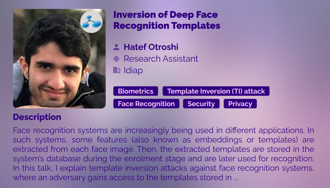Face recognition systems are increasingly being used in different applications. In such systems, some features (also known as embeddings or templates) are extracted from each face image. Then, the extracted templates are stored in the system’s database during the enrolment stage and are later used for recognition. In this talk, I explain template inversion attacks against face recognition systems, where an adversary gains access to the templates stored in the database of the system and tries to reconstruct underlying face from facial templates. The reconstructed face images not only reveal privacy-sensitive information (such as age, gender, etc.), but can also be used to impersonate. As a matter of fact, the reconstructed face images jeopardize both security and privacy of users: the adversary can use the reconstructed face image to impersonate and enter the system (security threat). In addition, the reconstructed face image not only reveal privacy-sensitive information of the enrolled user, such as age, gender, ethnicity, etc, but also provide a good estimation of subject’s face (privacy threat). Our experimental results demonstrate a critical vulnerability in face recognition systems.