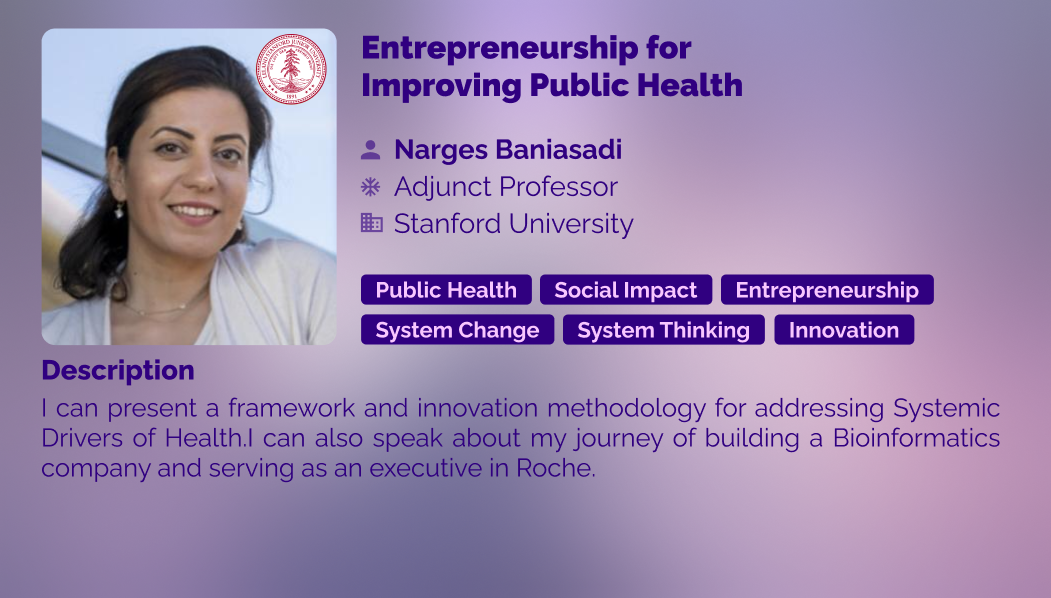 I can present a framework and innovation methodology for addressing Systemic Drivers of Health.I can also speak about my journey of building a Bioinformatics company and serving as an executive in Roche. https://ssir.org/articles/entry/systemic_drivers_of_health#