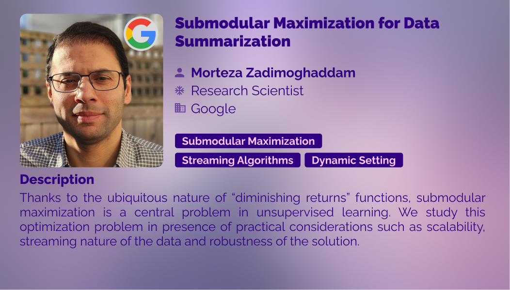 Morteza Zadimoghaddam is a senior research scientist at Google Cambridge office. Prior to Google, he did his PhD in computer science at MIT (CSAIL) under supervision of Professor Erik D. Demaine. He works on applying optimization techniques to various practical problems in order to find provably efficient algorithms. In particular, he applies infrastructure optimization methods to save computational resources at scale. On the mathematical and research side, he is interested in Submodular Optimization and its applications in large scale data mining and machine learning problems.
