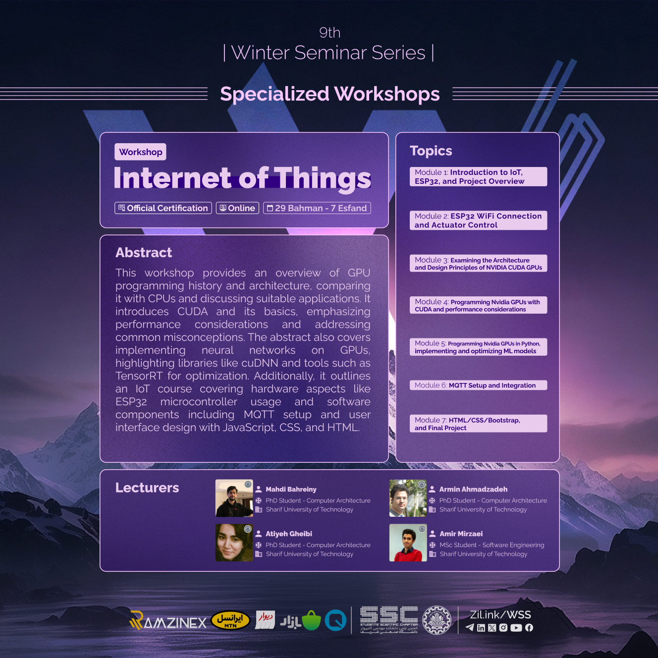 This workshop provides an overview of GPU programming history and architecture, comparing it with CPUs and discussing suitable applications. It introduces CUDA and its basics, emphasizing performance considerations and addressing common misconceptions. The abstract also covers implementing neural networks on GPUs, highlighting libraries like cuDNN and tools such as TensorRT for optimization. Additionally, it outlines an IoT course covering hardware aspects like ESP32 microcontroller usage and software components including MQTT setup and user interface design with JavaScript, CSS, and HTML.
